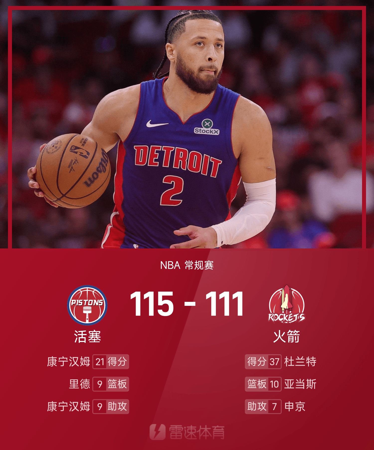 NBA战报:康宁汉姆21分7板9助,活塞115-111火箭
