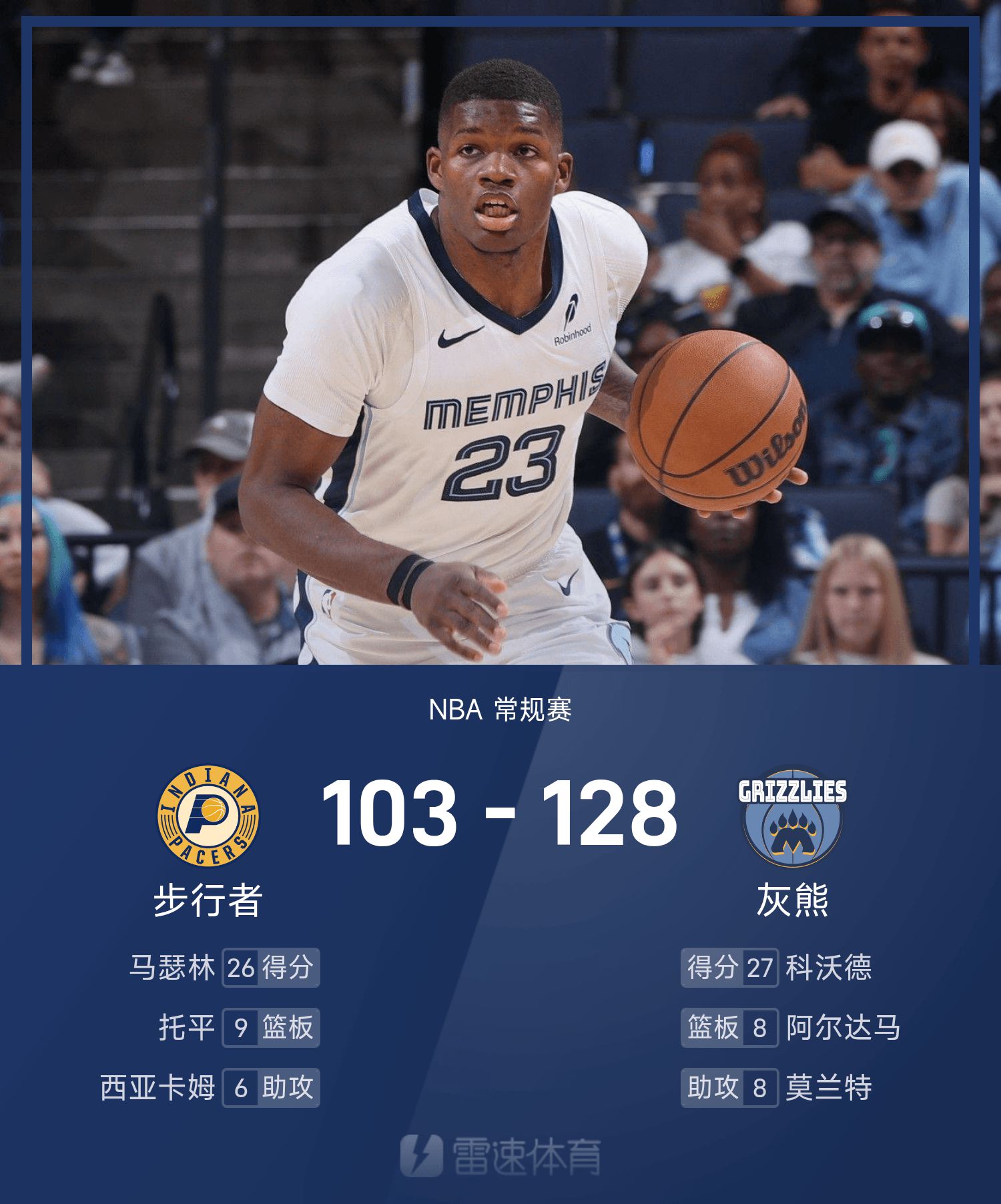 NBA战报:科沃德27分6板,灰熊128-103大胜步行者